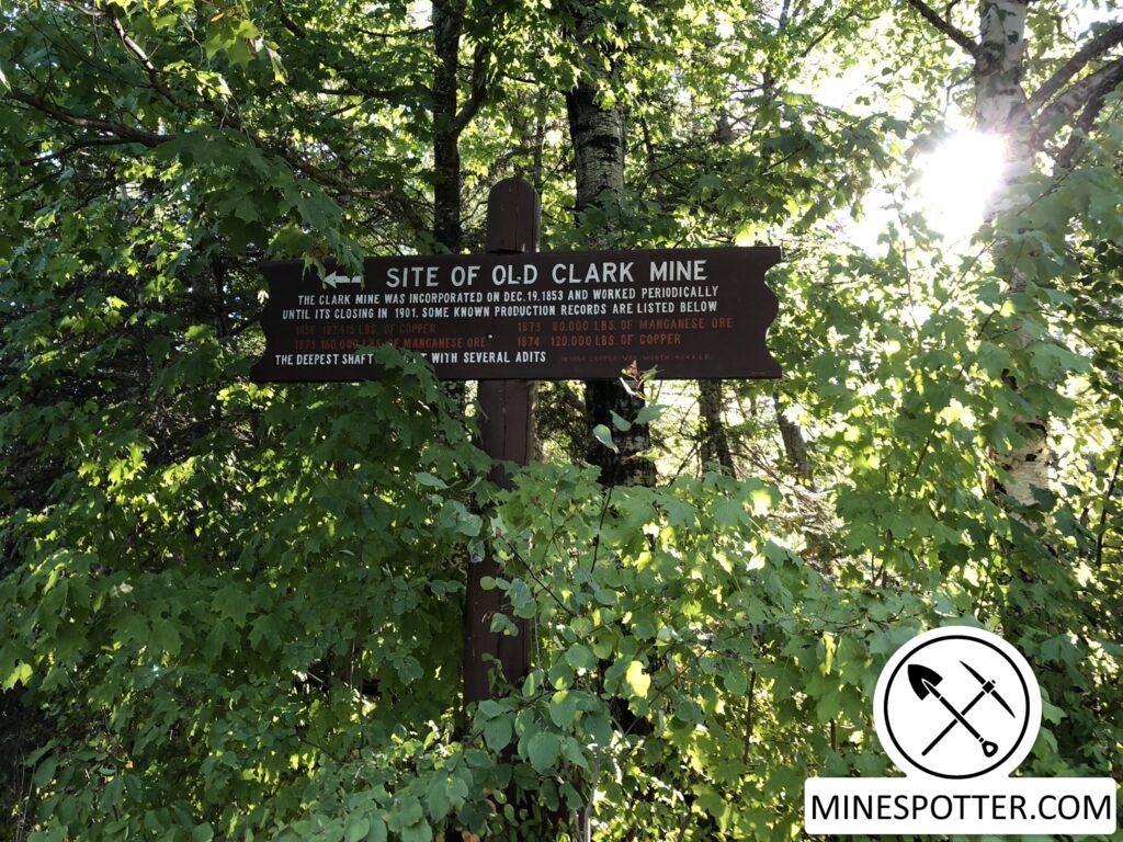 Clark Mine is a copper mine located right outside Copper Harbor, Michigan. The mine site has a sign pointing the way and an old smoke stack still standing. There are tailing piles around the site.