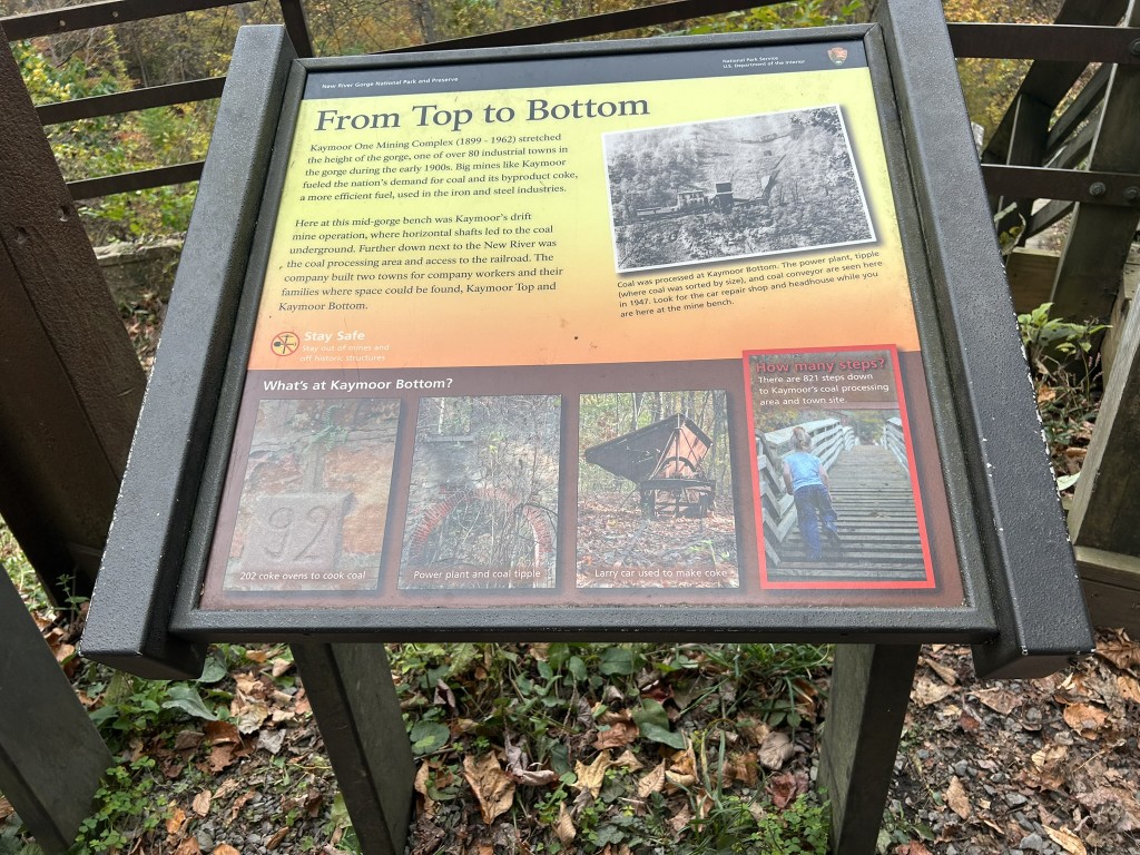 The Kaymoor Miners trail is located outside of Fayetteville and accessible by car. It's a popular destination because of a series of trails in the area. The walk down to Kaymoor Mine Bottom descends 1000 ft and over 800 steps.