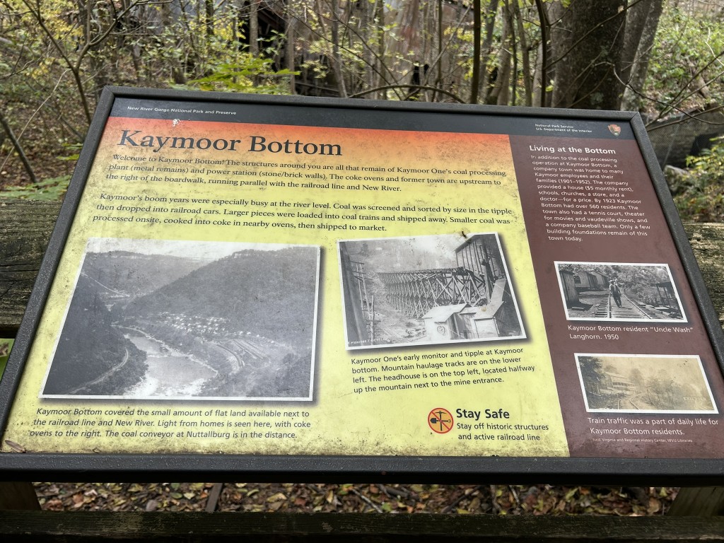 The Kaymoor Bottom consists of several buildings and a great deal of artifacts. You’ll see the processing plant, coke ovens, old haulage cart and rails that were used to haul ore and coal. There used to be a town with a doctor, store and over 500 residents but only foundations remain.